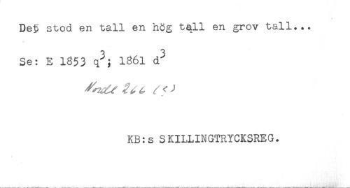 //// De§ stod en tall en hög tqll en grov tall... //// *T //// 1 3 //// Se: E 1853 q ; 1361 d^ //// KB:s S KILLINGTRYCKSREG. ////