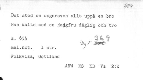 //// Det stod en ungersven allt uppå en bro //// Han äalte med en jungfru daglig och tro //// s. 654 „ - 7 //// mel.not. 1 str. //// Folkvisa, Gottland //// ARW MS KB Vs 2:2 ////