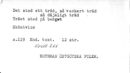 //// Det stod ett träd, så vackert träd //// så däjeligt träd //// Träet stod på bergwt //// Skämtvisa //// s.119 End. text. 12 str. //// ROTHMAN ÖSTGÖTSKA FOLKM. ////