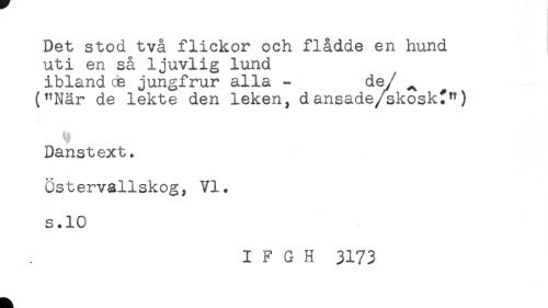 //// Det stod två flickor och flådde en hund //// uti en så ljuvlig lund //// ibland ce jungfrur alla - de/ ^ //// ("När de lekte den leken, dansade/skoskt") //// Danstext. //// Ostervallskog, VI. //// s.10 //// I F G H 3173 ////