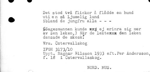 //// Det stod två flickor å flådde en hund //// ^^ uti e n så Ljumelig lund //// ^^ ibland de jungfru alla - - - //// ^Sagesmannen kunde ej erinra sig mer //// av sen leken,) När de lekteiaxE. den leken //// dansade de skoskf //// Vrm. Östervallskog //// IFGH 3173/10 //// Uppt. Ragnar Nilsson 1933 eft.Per Andersson, //// f. 16 i Ostervallaskog. //// NORD. MUS. ////