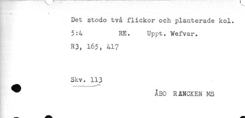 //// - //// Det stodo två flickor och planterade kol. //// 5:4 RE. Uppt. Wefvar. //// R3, 16$, 417 //// Skv. 113 //// ^ ÅBO RÅNCKEN MS ////