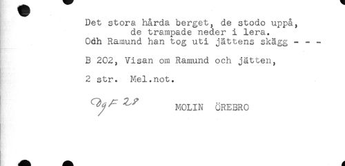 //// Det stora hårda berget, de stodo uppå, //// de trampade neder i lera. //// Odh Ramund han tog uti jättens skägg - - - //// B 202, Visan om Ramund och jätten, //// 2 str* Mel.not. //// MOLIN OREBRO ////