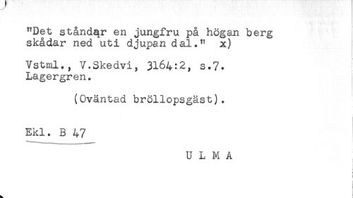 //// "Det ståndqr en jungfru på högan berg //// skådar ned uti djupan dal." x) ! //// Vstml., V.Skedvi, 3164:2, s.7. //// Lagergren. //// (Oväntad bröllopsgäst). //// Ekl. B 47 //// U L M A //// t //// f //// ! //// h. ////
