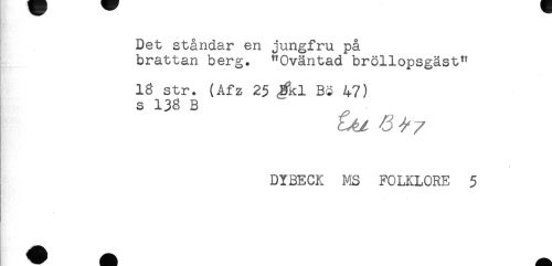 //// Det ståndar en jungfru på //// brattan berg. "Oväntad bröllopsgäst" //// 18 str. (Afz 25 <%kL Bä 47) //// s 138 B //// DYBECK MS FOLKLORE 5 ////