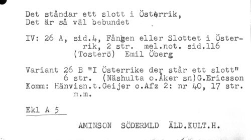 //// Det ståndar ett slott i österrik, //// Det är så väl bebundet //// IV: 26 A, sid.4, Fången eller Slottet i Öster- //// rik, 2 str. mel.not. sid.116 //// (Tosterö) Emil Öberg //// Variant 26 B "I Österrike der står ett slott" //// 6 str. (Näshulta o.Åker sn)G.Ericsson //// Komm: Hänvisn.t.Geijer o.Afz 2: nr 40, 17 str. //// m.m. //// Ekl A //// AMINSON SÖDERMLD ÄLD.KULT.H. ////