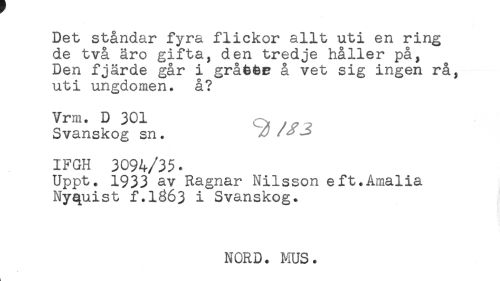 //// Det ståndar fyra flickor allt uti en ring //// de två äro gifta, den tredje håller på, //// Den fjärde går i grå66e å vet sig ingen rå, //// uti ungdomen, å? //// Vrm. D 301 //// Svanskog sn. ^ //// /IFGH 3094/35. //// Uppt. 1933 av Ragnar Nilsson eft.Amalia //// Nyquist f.1363 i Svanskog. //// NORD. MUS. ////