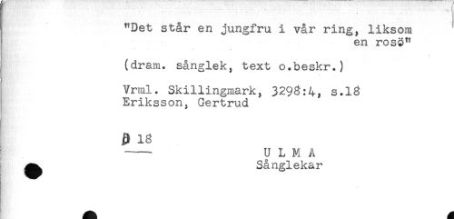 //// t ...... .... " - //// "Det står en jungfru i vår ring, liksom ' //// en rosö" //// --. - -i //// * //// j (dram. sånglek, text o.beskr.) //// ** * . //// Vrml. Skillingmark, 3298:4, s.18 //// Eriksson, Gertrud //// --U L M A //// ^ Sånglekar ////