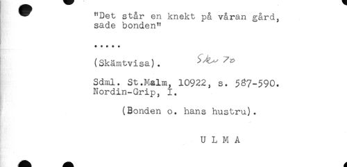 //// ^ "Det står en knekt på våran gård, //// sade bonden" //// ! //// (Skämtvisa). //// HM''' //// Sdml. St.Malm, 10922, s. 5^7-590. //// Nordin-Grip, 1. //// (Bonden o. hans hustru). //// ! //// U L M A ////