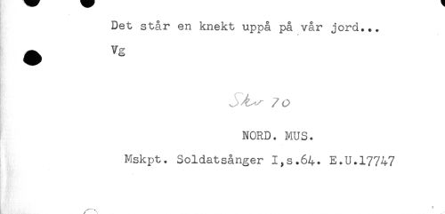 //// Det står en knekt uppå på vår jord... //// /o //// NORD. MUS. //// Mskpt. Soldatsånger I,s.64. E.U.17747 //// r - ////
