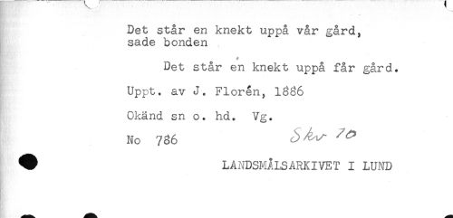 //// Det står en knekt uppå vår gård, //// sade bonden //// '' * //// Det står en knekt uppå får gård. //// Uppt. av J. Floren, 1886 //// Okänd sn o. hd. Vg. //// No 786 ^ //// W LANDSMÅLSARKIVET I LUND ////