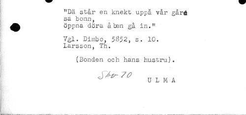 //// "Dä står en knekt uppå vår gåré //// I sa bonn, //// I ^^ öppna döra åben gå in." //// Vgl. Dimbo, s. 10. //// Larsson, Th. //// (Bonden och hans hustru). //// - //// ^ U L M A ////