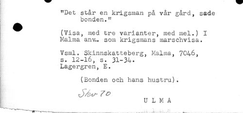 //// "Det står en krigsman på vår gård, sade //// bonden." //// (Visa, med tre varianter, med mel.) I //// Malma anv.. som krigsmans marschvisa. //// Vsml. Skinnskatteberg, Malma, 7046, //// s. 12-16, s. 31-34. //// Lagergren, E. //// j (Bonden och hans hustru). //// U L M A ////