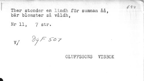 //// ^ Ther stonder en lindh för sunnan åå, //// bär blomster så våldh, //// Nr 11, 7 str. //// v/ ^ / ^ 7 //// OLUFFSSONS VISBOK //// < ////
