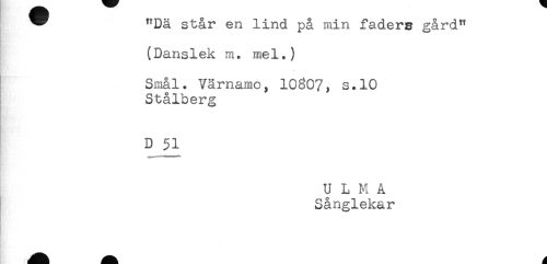 //// " "Dä står en lind på min faders gård" //// (Danslek m. mel.) //// Smål. Värnamo, 10807, s.10 //// Stålberg //// D 51 //// U L M A //// Sånglekar ////