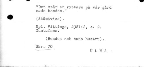 //// "Det står en ryttare på vår gård //// sade bonden." //// ^^ (Skämtvisa). //// Upl. Vittinge, 23^1:2, s. 2. //// Gustafson. //// (Bonden och hans hustru). //// . //// h*** //// Skv. 70 //// ---U L M A //// _____ . . ' . ////