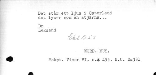 //// Det står ett ljus i Österland //// det lyser som en stjärna... //// Dr //// Leksand //// NORD. MUS. //// - //// ^ Mskpt. Visor VI. s.R 455. E.U. 24331 ////
