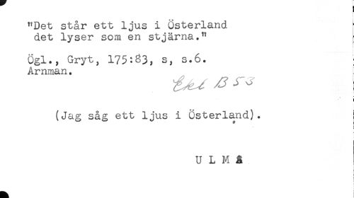 //// "Det står ett ljus i österland //// det lyser som en stjärna." //// ögl., Gryt, 175:^3, s, s.6. - //// Amman. //// i //// (Jag såg ett ljus i Österland). //// U L M 3 //// ! ////
