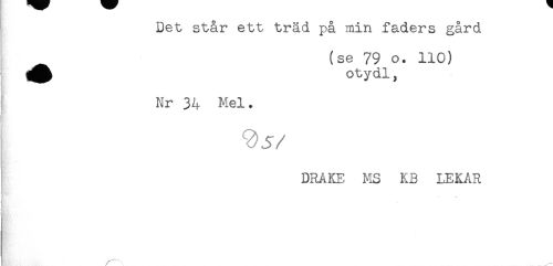 //// Det står ett träd på min faders gård //// (se 79 o. 110) //// ^^ otydl, //// Nr 34 Mel. //// 9 , ^ //// DRAKE MS KB LEKAR ////