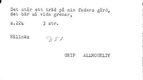 //// t //// t //// Det står ett träd på min faders gård, ? //// det bär så vida grenar, //// s.224 3 str. //// * //// Hållnäs j-y //// : //// i //// GRIP ALLMOGELIV ////
