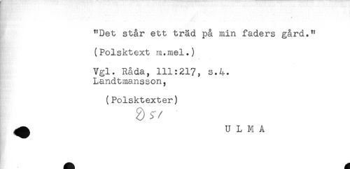 //// - t //// "Det står ett träd på min faders gård." //// (Polsktext m.mel.) //// * ! //// Vgl. Råda, 111:217, s.4. //// Landtmansson, //// (Polsktexter) //// ^ U L M A ////