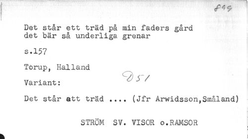 //// Det står ett träd på min faders gård //// det bär så underliga grenar //// s.157 //// Torup, Halland //// Variant: ^ '' //// Det står att träd .... (Jfr Arwidsson,Småland) //// t //// t //// i //// i //// i //// STRÖM SV. VISOR o.RAMSOR //// L //// ä t ////