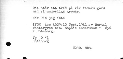 //// Det står ett träd på vår faders gård //// med så underliga grenar. //// Mer kan jag inte //// IFGH Acc 4609:10 Uppt.1941 av Bertil //// Westergren eft. Sophie Andersson f.1^56 //// i Göteborg. //// Vg D 51 //// ^^ Göteborg //// NORD. MUS. //// ) ////