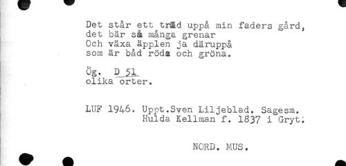 //// Det står ett träd uppå min faders gård, //// det bär så många grenar //// Och växa äpplen ja däruppå //// ! som är båd röda och gröna. //// Ög* //// olika orter. //// LUF 1946. Uppt.Sven Liljeblad. Sagesm. //// Hulda Kellman f. 1837 i Gryt; //// NORD. MUS. ////