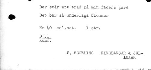 //// Der står ett träd på min faders gård //// ^^ Det bär så underliga blommor //// Nr 40 mel.not. 1 str. //// D 51 //// Tcomm. //// F. EGGELING RINGDANSAR & JUL- //// IEKAR //// f ^ //// I ////