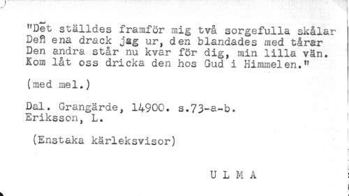 //// "Det ställdes framför mig två sorgefulla skålar //// DeR ena drack jag ur, den blandades med tårar //// Den andra står nu kvar för dig, min lilla vän. //// Kom låt oss dricka den hos Gud i Himmel en." //// (med mel.) //// Dal. Grangärde, 14900. s.73-a-b. //// Eriksson, L. //// (Enstaka kärleksvisor) //// U L M A ! ////