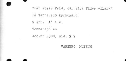//// "Det susar frid, där våra fäder vilar-" //// På Tännersjö kyrkogård //// 9 str. å^ 4 v. //// Tönnersjö sn //// Acc.nr 43^8, sid. g 7 //// VARBERG MUSEUM ////