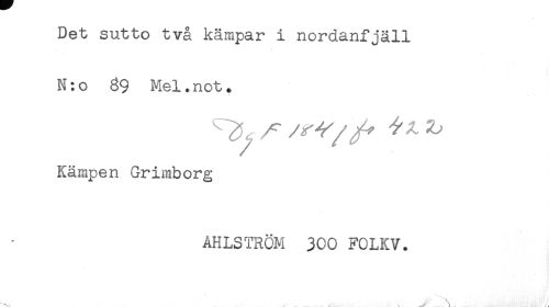 //// Det sutto två kämpar i nordanfjäll //// N: o 89 Mel. not. //// Kämpen Grimborg //// AHLSTRÖM 300 FOLKV. //// \ ////