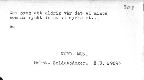 //// Det syns att aldrig vår det vi mista //// som ni ryckt in nu vi rycka ut... //// * //// . //// Bo //// NORD. MUS. //// - //// Mskpt. Soldatsånger. E.U. 29895 //// ! //// < //// t //// h ////