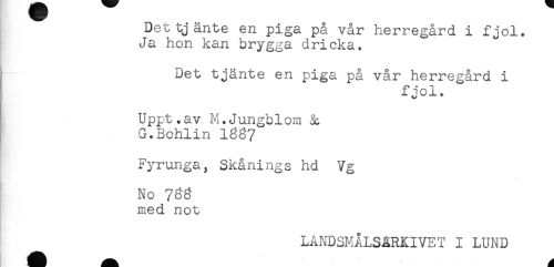 //// Det tjänte en piga på vår herregård i fjol. //// Ja hon kan brygga dricka. //// Det tjänte en piga på vår herregård i //// fjol. //// Uppt.av M.Jungblom & //// G.Bohlin 1337 //// Fyrunga, Skånings hd Vg //// No 788 //// med not //// LANDSMÅLSARKIVET I LUND ////