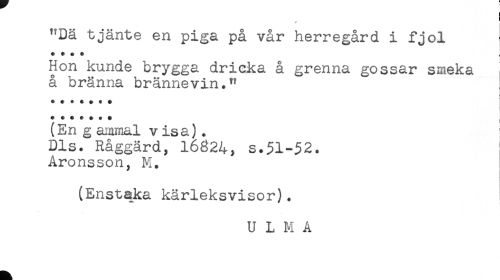//// < //// ! //// "Dä tjänte en piga på vår herregård i fjol //// * * + * ^ //// Hon kunde brygga dricka å grenna gossar smeka //// å bränna brännevin." //// t //// ******* I //// (En g ammal v isa) . //// Dis. Råggärd, 16824, s.51-52. //// Aronsson, M. //// (Enstqka kärleksvisor). //// U L M A ////
