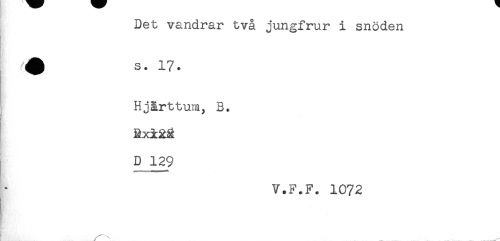 //// Det vandrar två jungfrur i snöden //// Hjärttum, B. //// HK //// Rxi^ //// D 129 //// V.F.F. 1072 //// f //// t*'.. //// / ' ////