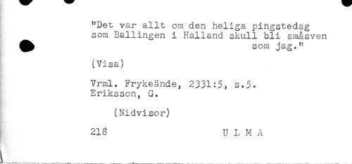 //// "Det var allt om den heliga pingstedag //// som Ballingen i Halland skull bli småsven //// som jag." //// (Visa) //// Vrml. Frykeände, 2331:$, s.5. //// Eriksson, G. //// (Nidvisor) //// 213 U L M A ////