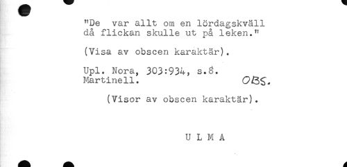 //// "De var allt om en lördagskväll //// då flickan skulle ut på leken." //// (Visa av obscen karaktär). //// Upl. Nora, 303:934, s.3. //// Martinell. //// (Visor av obscen karaktär). //// U L M A ////