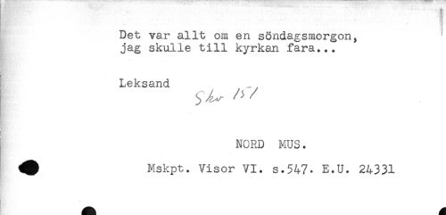 //// ! J' <.< - ; . .....- .'.. <' . . - - ' . //// Det var allt om en söndagsmorgon, //// jag skulle till kyrkan fara... //// - //// Leksand //// g? //// NORD MUS. //// ^ Mskpt. Visor VI. s.547. E.U. 24331 ////