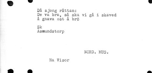 //// Då sjöng råttan: //// De va bra, så ska vi gå i skaved //// å gnava ost å brö //// Sk //// Asmundstorp //// NORD. MUS. //// Ha Visor ////