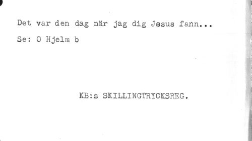 //// ! //// ! //// Det var den dag när jag dig Jesus fann... //// Se: O Hjelm b //// : //// i //// } //// ! //// KB:s SKILLINGTRYCKSREG. ////