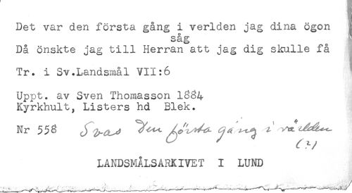 //// Det var den första gång i verlden jag dina ögon //// såg //// Då önskte jag till Herran att jag dig skulle få //// Tr* i Sv.Landsmål VII:6 //// Uppt. av Sven Thomasson 18^4 //// Kyrkhult, Listers hd Blek. //// < ^ //// Nr 5^^ i ^^ VA^a^ //// LANDSMÅLSARKIVET I LUND ////