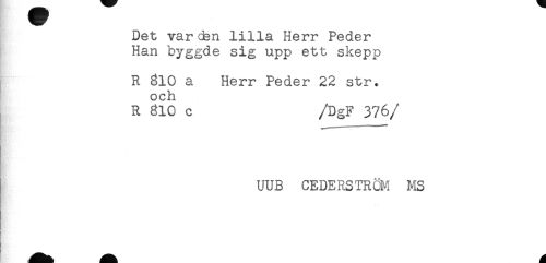 //// Det var den lilla Herr Peder //// Han byggde sig upp ett skepp //// R 610 a Herr Peder 22 str. //// och //// R 810 c /DgF 376 //// /UUB CEDERSTRÖM MS ////