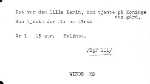 //// Det var den lilla Karin, hon tjente på Köninge //// ens gård, //// Hon tjente der för en tärna //// Nr 1 15 str. Melönot. //// /DgF 101 //// /-- T* //// WIEDE MS ////