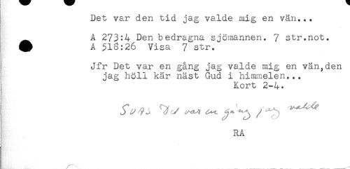 //// Det var den tid jag valde mig en vän... //// A 273^4 Den bedragna sjömannen. 7 str.not. //// # A 518:26 Visa 7 str. //// I Jfr Det var en gång jag valde mig en vän,den //// jag höll kär näst Gud i himmelen... //// Kort 2-4^ //// RA //// - //// \ ..... ////