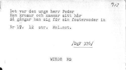 //// 7/J //// ( . . //// Det var den unge herr Peder //// Han krusar och kammar sitt hår //// Så gångar han sig för sin fostermoder in //// Nr 12 str. Mel.not. //// /DgF 376 //// /t //// WIEDE MS //// t //// F //// ä ////