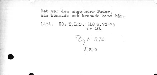 //// Det var den unge herr Peder, //// han kammade och krusade sitt hår. //// 14:4. HO. S.L.S. 318 s.72-75 //// nr 40. //// YL - J. / ^ //// ÅBO ////