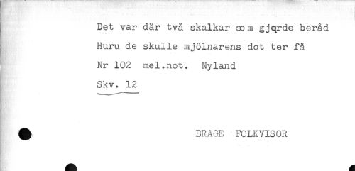 //// t - -' ' . i //// r //// Det var där två skalkar som gjqrde beråd //// Huru de skulle mjölnarens dot ter få //// Nr 102 mel.not. Nyland //// Skv. 12 //// ^ BRAGE FOLKVISOR ////