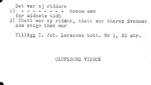 //// Det var ej riddare //// 1) --- honom aen //// for midnatz tidh //// 2) Thett war ey ridder, thett war theres Svenner //// som stigo then mur //// Tillägg 1. Joh. Larssons bokt. Nr 1, 22 str. //// CLUFSSONS VISBOK //// "i ////