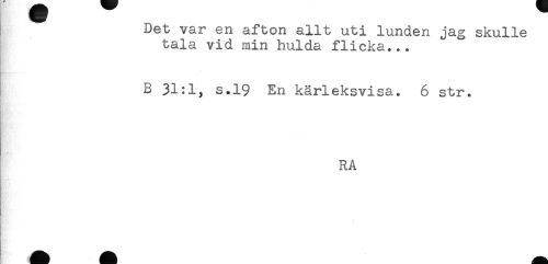 //// Det var en afton allt uti lunden jag skulle //// tala vid min hulda flicka... //// B 31:1, s.19 En kärleksvisa. 6 str. //// RA ////